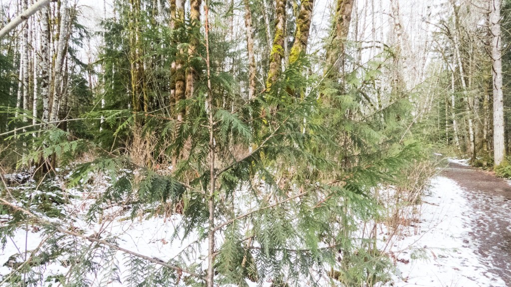 Here’s an interesting illustration of what underplanting is. Not all trees can germinate and grow in shade cast by the overstory. Douglas fir is an example. But cedar and hemlock and can. These cedar were planted along the Log Train Trail at the Burde Street Entrance. About 8-10 years ago Frank Stini’s crew planted them. Port Alberni resident, Dave Jarret says he was one of the ones who helped plant them; he’d know exactly when they went in the ground.