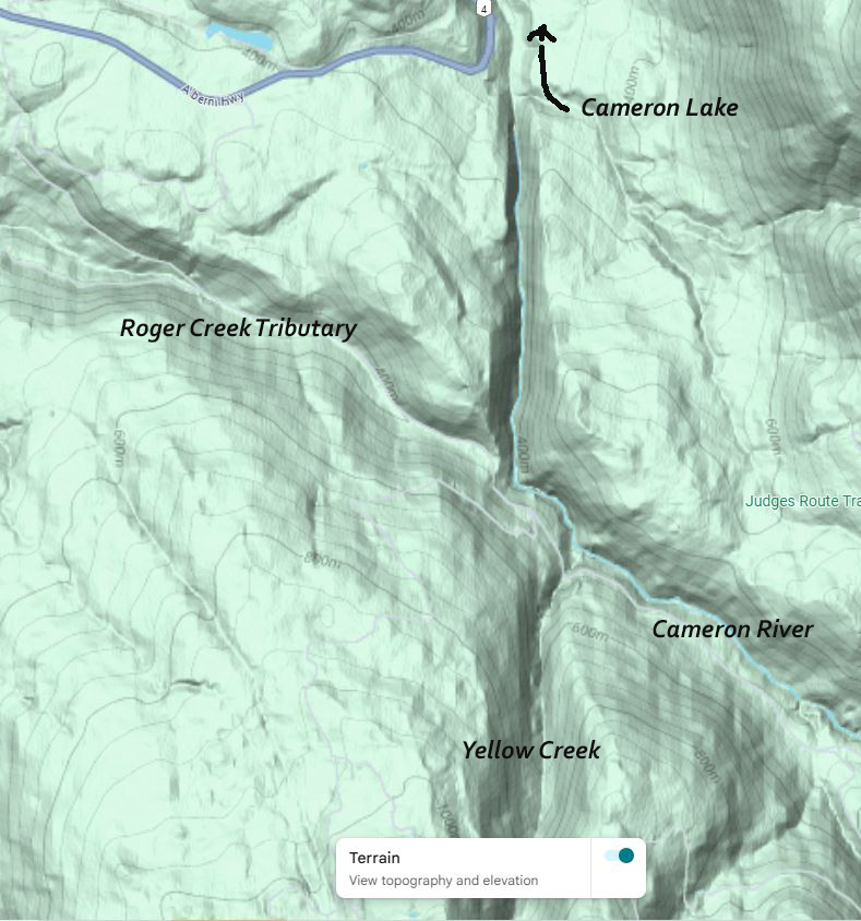 Google Maps offers a possible answer – the Cameron River. A small ephemeral tributary of Roger Creek flows from a location near the top bank of a large ravine through which the Cameron River flows. But the bottom of the ravine and the Cameron River, is 60 meters below. Confused? See the maps below.