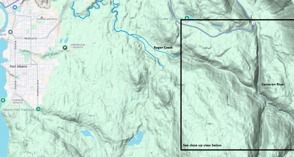 Roger Creek flows through Port Alberni into the mouth of the Somass River. It is fairly unremarkable near tidewater. But 600 meters upstream, it runs through the bottom of a canyon that that has been carved through a big slab of shale bedrock before it hits tidewater. The top is about 25 meters above the creek and the cliffs are near vertical. The canyon is about 10 km long and big enough to make me wonder where all the water came from to make such a large canyon. The upper reaches of the creek flow down from the shoulders of McLaughlin Ridge, a high plateau that forms the western slopes of the Cameron River. There is no sign of the water needed.
